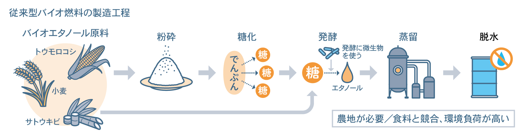 しかし、この方法はグルコースを得るために農作物を栽培する必要があるため、食料生産との競合が起こります。また、農地に適した場所でしか原料を生産できないといった制約もあり、長期的な持続可能性を考えると課題が残ります。