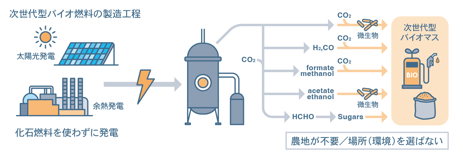 - 農地に依存せず、発電所や化学工場など任意の場所で必要な化学品や燃料を生産できるようになる。