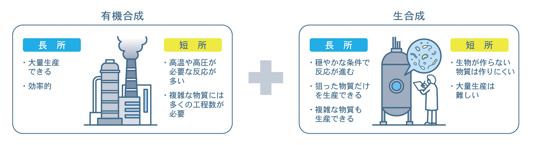 - 生合成と有機合成を組み合わせることで、環境負荷の少ないものづくりが可能になる。