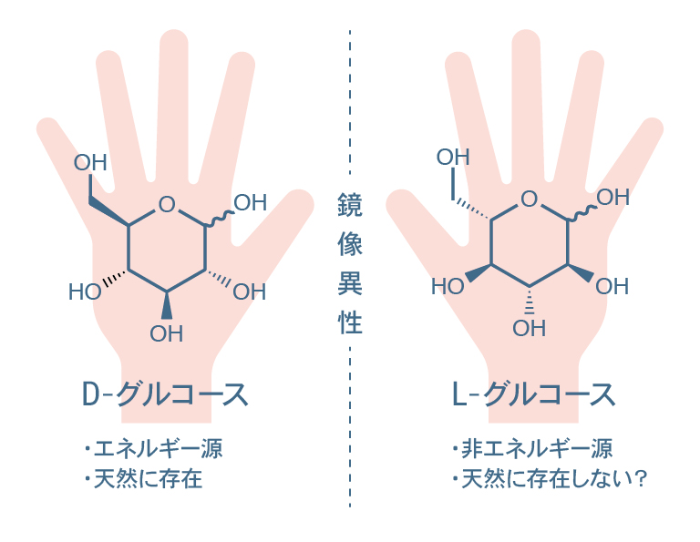 糖は、空間における向きや形が決まった構造を持ち、構成原子やつながり方が同じでも、鏡に映したように左右が反転した「鏡像異性体」が存在します。生物がエネルギー源や細胞の材料として広く利用するグルコースにも、D-グルコースと L-グルコースの2種類の鏡像異性体があります。