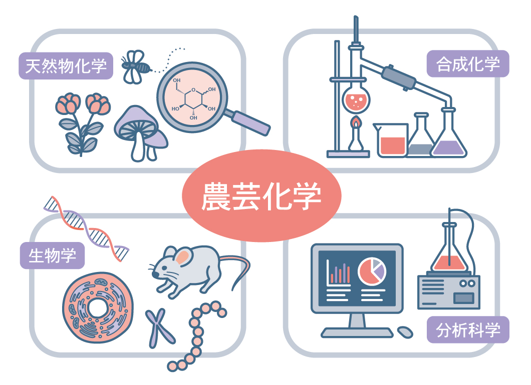 農芸化学の強みは、微生物から植物、動物、さらには環境中の分子まで、あらゆる生命体系を扱えることです。こうして解き明かされた生命現象は、医療、農業、工業など多様な分野に応用されていきます。