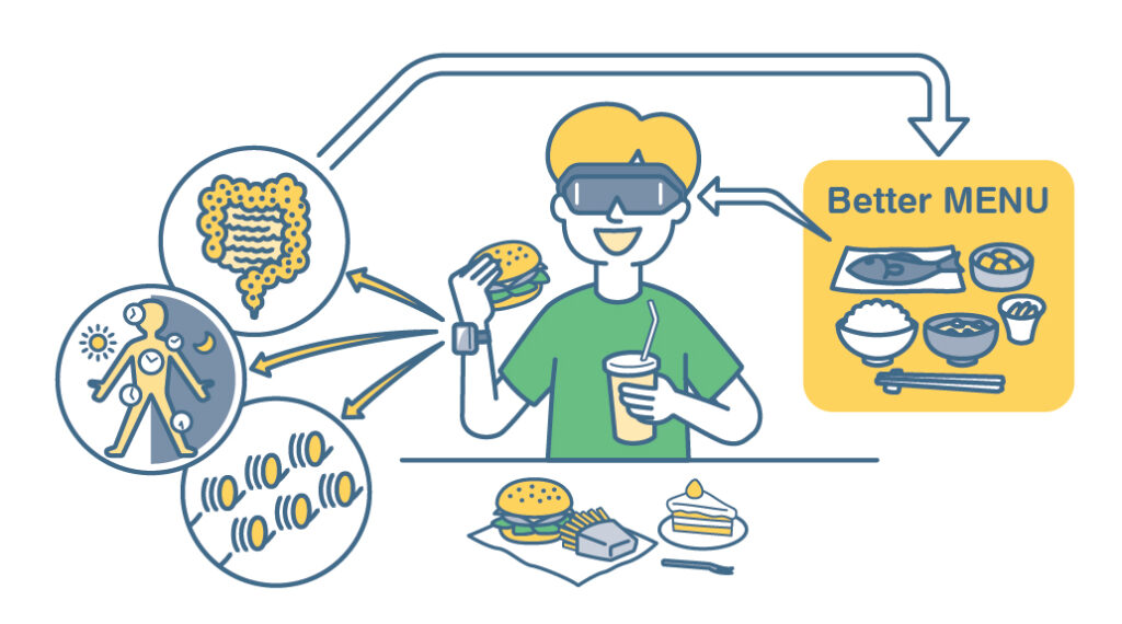 将来的には、ウェアラブル機器が測定した生活習慣や体内モニタリングのデータ、腸内細菌・遺伝子などの情報などから、AIがその人だけの食事メニューや食べるタイミングを提案する世界が考えられます。無理なダイエットや我慢をしなくても、好きな食事を楽しみながら自然と健康になれる未来が訪れるかもしれません。